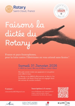Le Rotary Club de Saint-Cloud et la société des membres de la Légion d’Honneur organisent la première dictée du Rotary à Saint-Cloud, un événement ludique, éducatif et solidaire. Cette opération permettra de soutenir l’association « La Passerelle » à Saint-Cloud, association engagée dans des actions de soutien et d’accompagnement scolaire, actions qui s’inscrivent dans l’axe stratégique du Rotary « Alphabétisation et éducation, prévention de l'illettrisme ».